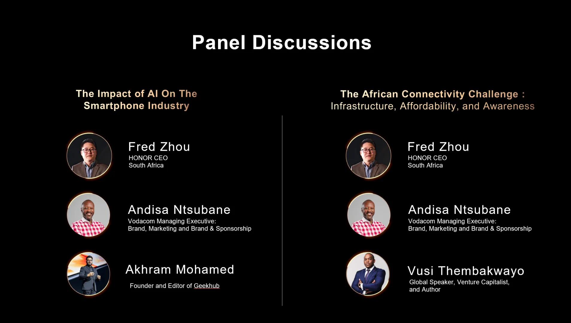- Panellists: Fred Zhou (HONOR CEO), Andisa Ntsubane; Managing Executive: Brand, marketing, and Brand Sponsorship (Vodacom), Vusi Thembekwayo; Global Speaker, Venture Capitalist and Author